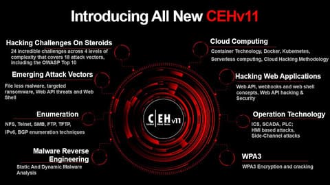 Module 18: IoT Hacking: Recognizing the vulnerabilities in IoT and ensuring the safety of IoT devices. Operational Technology (OT) essentials, introduction to ICS, SCADA, and PLC, threats, attack methodologies, and attack prevention. The concept of OT is a new addition.